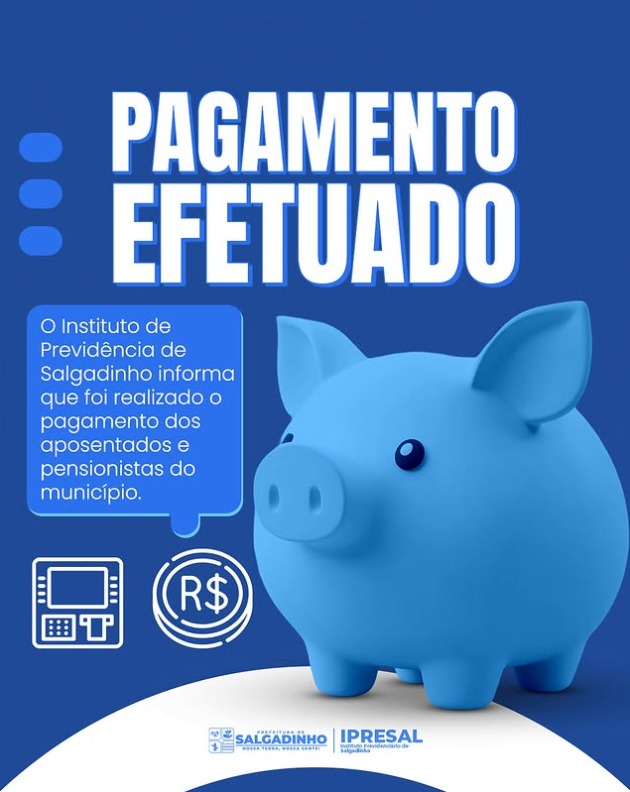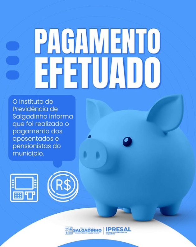 A Prefeitura de Salgadinho informa que o pagamento referente ao mês de outubro já foi creditado na conta de todos os servidores do município, incluindo efetivos, comissionados e contratados.