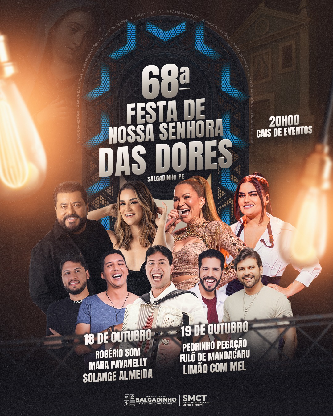 O Governo Municipal de Salgadinho, através da Secretaria de Cultura e Turismo, divulga as datas da 60ª Festa de Nossa Senhora das Dores. Segundo o Secretário Fellipe Cavalcante, serão três dias de festividade, sendo elas 13, 14 e 15 de Outubro, dentro das atrações, teremos apresentações culturais, apresentações religiosas e shows artísticos de nível nacional e regional.