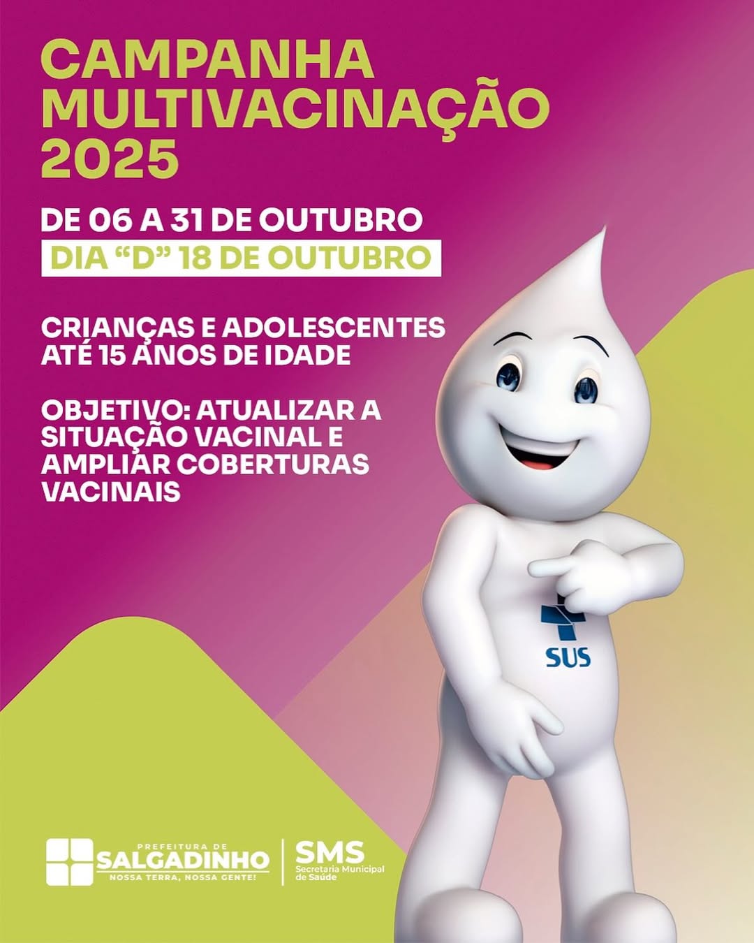 A Prefeitura de Salgadinho, por meio da Secretaria Municipal de Saúde, realizará neste sábado, dia 31, o Dia D da Vacinação Antirrábica 2025, com o objetivo de proteger cães e gatos e prevenir a raiva no município.
