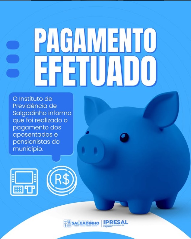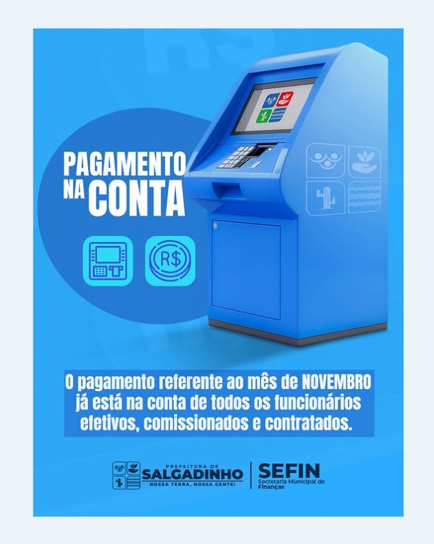 A Prefeitura de Salgadinho informa que o pagamento referente ao mês de novembro já foi creditado na conta de todos os servidores municipais, incluindo efetivos, comissionados e contratados.