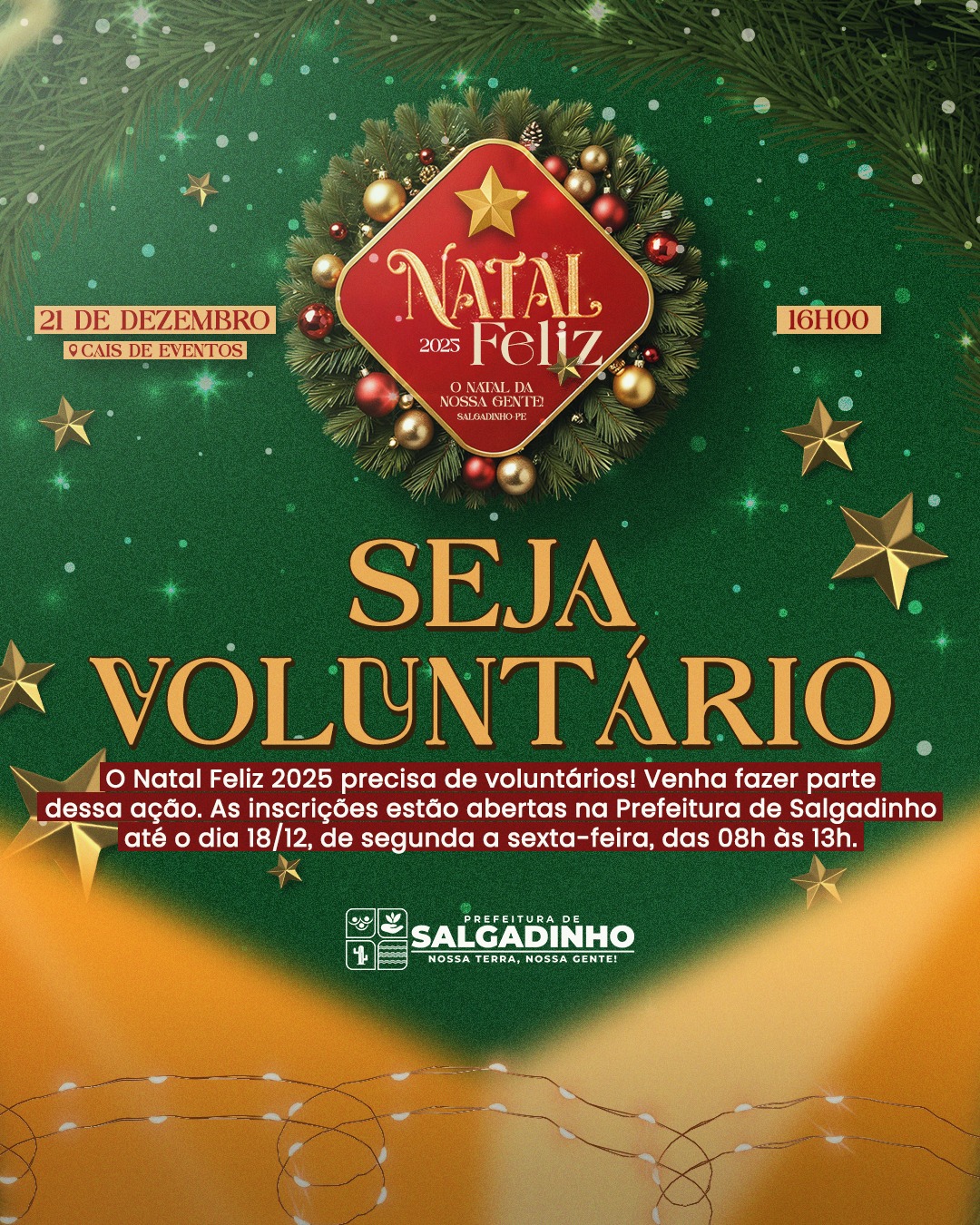 A Prefeitura de Salgadinho convida a população a participar como voluntária do Natal Feliz 2025, evento que celebra o espírito de união, solidariedade e cuidado com a comunidade.