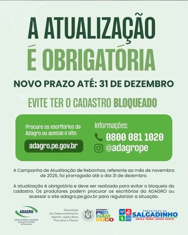A Prefeitura de Salgadinho informa que a Campanha de Atualização de Rebanhos, referente ao mês de novembro de 2025, foi prorrogada até o dia 31 de dezembro.