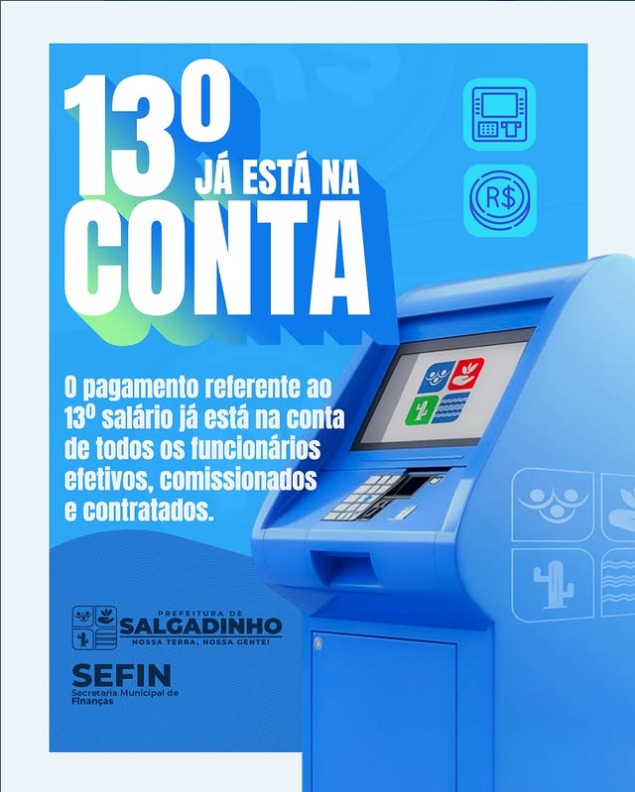 A Prefeitura de Salgadinho, por meio da Secretaria Municipal de Finanças (SEFIN), informa que o pagamento do 13º salário já foi creditado na conta de todos os servidores municipais, incluindo efetivos, comissionados e contratados.